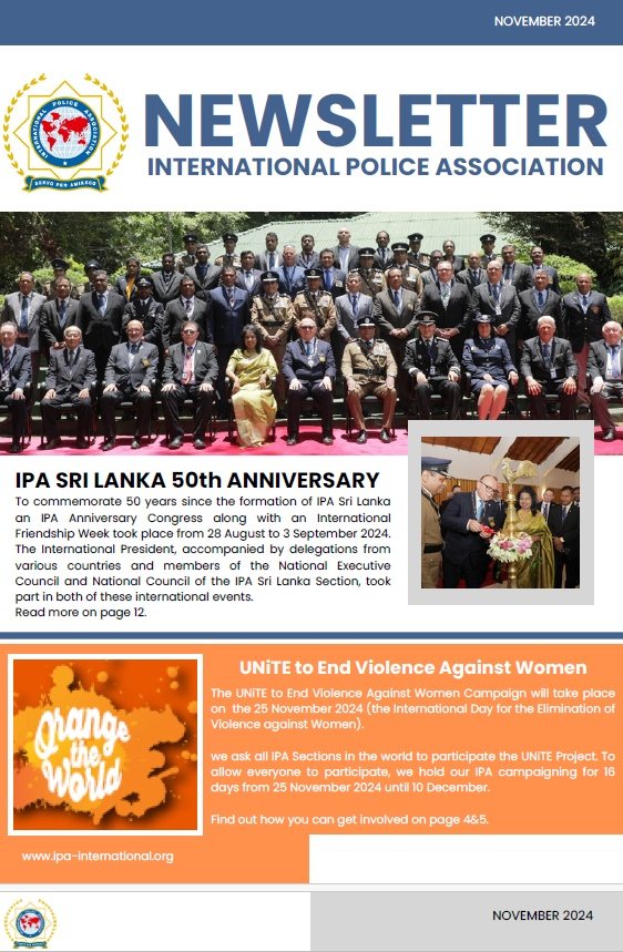 The International Police Association is a friendship organisation for members of the police force, whether in employment or retired, and without distinction as to rank, position, gender, race, language or religion. We have around 372,000 members in nearly 100 countries, of which 65 are affiliated National Sections, and we are represented on 6 continents.